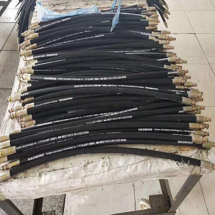 高压胶管总成一般是由耐液体的合成橡胶内胶层、中胶层、Ⅰ至Ⅵ层钢丝编织增强层、及耐天候性能优良的合成橡胶外胶层组成。主要用于矿井液压支架、油田开采,适宜于工程建筑、起重运输、冶金锻压、矿山设备、船舶、注塑机械、农业机械、各种机床以及各工业部门机械化、自动化液压系统中输送具有一定压力和温度的石油基(如矿物油、可溶性油、液压油、燃油、润滑油)液体、水基液体(如乳化液、油水乳浊液、水)、气体等和液体传动等领域。