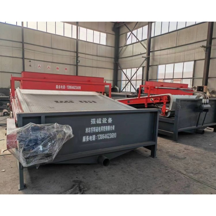 平板磁选机是目前表面磁场高、产量大、除铁效果好的一种新式除铁设备,表面磁场可以达到18000GS以上,输送带上面可达到12000GS以上,对矿物中的弱磁铁有吸附能力,除铁效果明显。