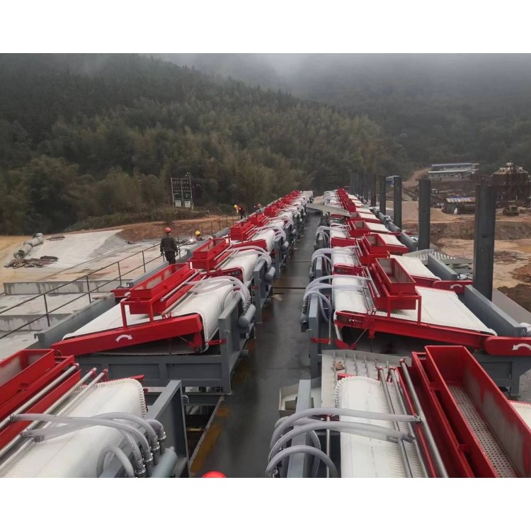 采用带式分选结构,在整个工作区域从进料到出料,物料在皮带的带动下,可对物料进行多次磁搅拌,同时在水流的冲洗作用下,把不含磁的尾矿除去,带有磁性的矿物被皮带输送到板选机的脱磁区,从而将带有磁性的矿物通过脱磁装置脱掉,来完成选矿的过程,整机功率小、处理大,磁场强度高,并达到很好的品质,能够获得大的效益。