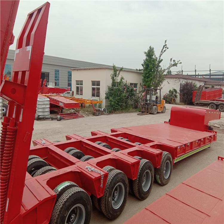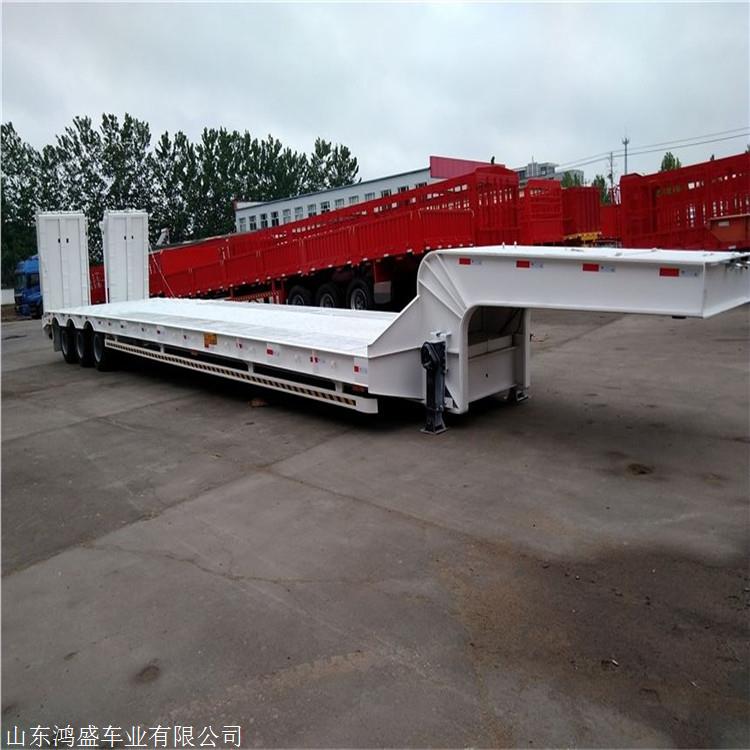 商信通会员产品详情 山东梁山鸿盛挂车有限公司 低平板半挂车 车载部位无栏板,用途广泛,主要用于中长途货运运输。系列半挂车车架为穿梁式结构,纵梁采用平直式活鹅颈式。腹板高度从400mm至550mm,纵梁采用自动埋弧焊焊接,车架采用喷丸处理,横梁穿入纵梁并焊接整体。串联式干板弹簧和悬挂支座组成,结构合理,具有较强的刚性和强度,用来支承载荷缓冲击。 及其他重载货物, ,运输高货物和通过头顶障碍的能力 。低平板半挂车结构和装载 低平板半挂车 采用凹梁式(或者井型)车架,既车架前段为鹅颈(鹅颈前段的牵引销与牵引车上的牵引鞍座相连,鹅颈后端与半挂车架相连),中段为货台(车架低部分),后端为轮架(含车轮)。在往低平板半挂车上装载机械设备时, 是从半挂车后端装载机械设备,即采用从后轮架上 面移动机械设备或者将车轮移除的方式, 然后再将机械设备固定在半挂车上。低平板式半挂车行走结构使用度钢材质,整车自重轻,