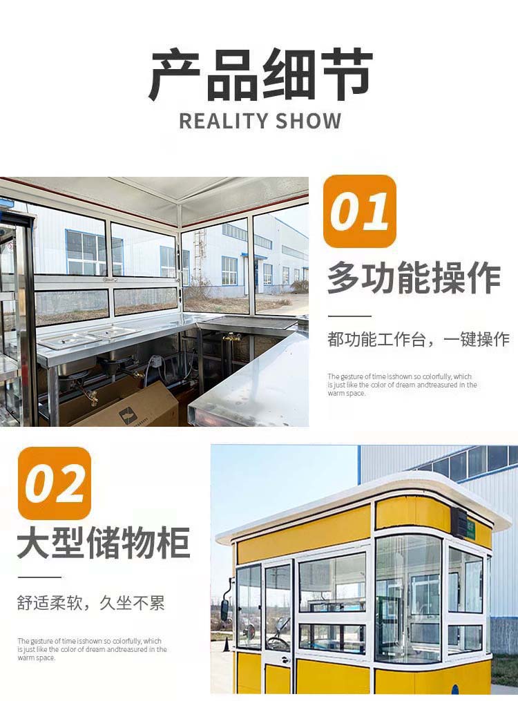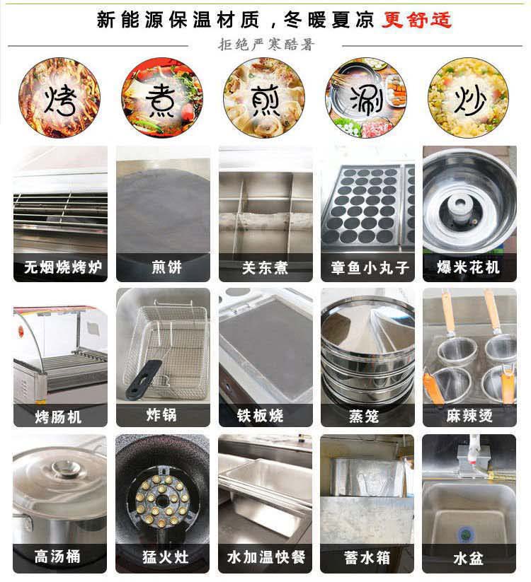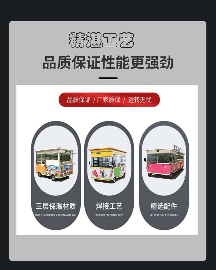 小吃车的性能好:多功能小吃车采用高扭矩,低功耗的电机,电瓶采用上先进的大容量专用电瓶,性能稳定,行驶时间长;小吃车速度快,控制部分采用慢车启动,快车行驶。可以方便快速的开到学校、集市和工业区等闹市地方;小吃车安全性高,制动采用高性能刹车装置,解决上坡制动不溜车;多功能小吃车电动铁壳四轮有脚刹或是手刹,使用车辆安全可靠,多重保险;整车采用板式弹簧避震,安全舒适。 小吃车是一种比较常见的街边流动经营工具,可做烧烤、麻辣烫、铁板烧、油炸肉串、巧克力鲜果串、珍珠奶茶、酸辣粉。 小吃车电瓶天能或者超威全国联保质保一年,电机控制器一年质量保修,玻璃易碎件,厨具等高强度消耗不在保修范围之内。