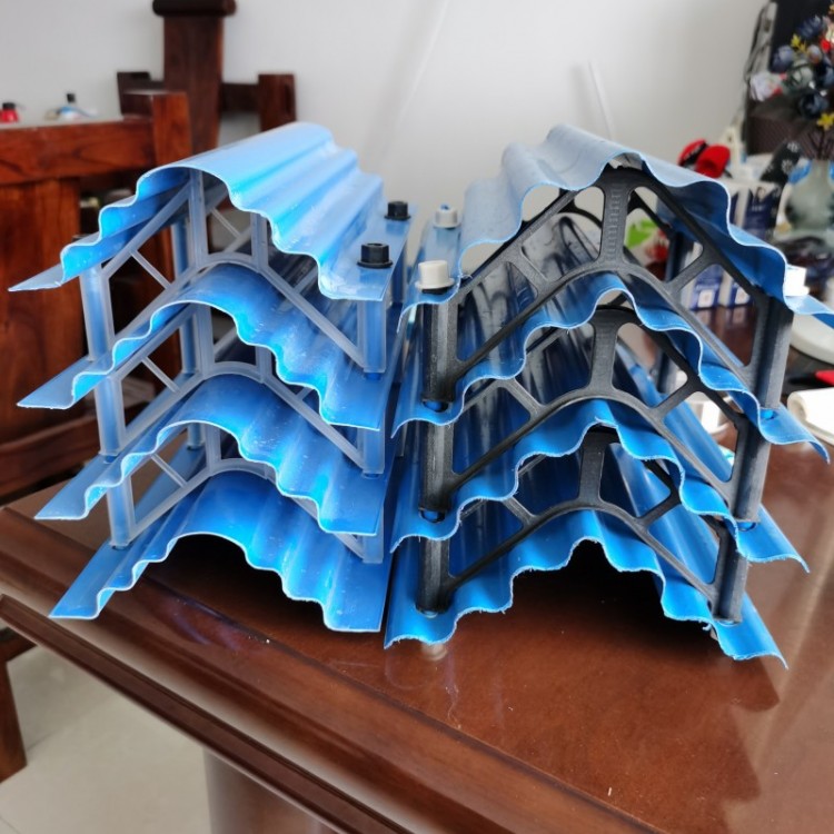 冷却塔多波收水器是减除冷却塔排出湿热空气中夹带的大量细小水滴漂移物,避免对周围环境的水雾污染、结冰、节水和保护环境的装置。160-50型高效低阻收水器,采用frp材料或pvc材料挤压成型,在收水器的片材中增加了进口碳黑作为添加剂,大大提高了片材的抗紫外线和抗老化性能。