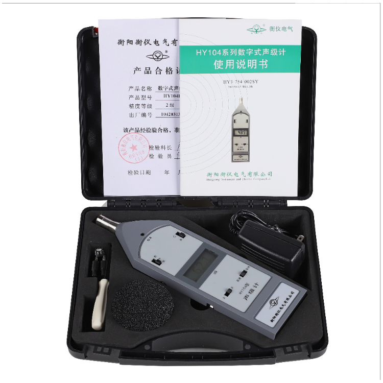 HY104型声级计是一款2级手持式仪器,其性能符合国家标准GB/T 3785.1-2010《电声学 声级计 第1部分:规范》和国际标准IEC 61672-1:2002对2级X类声级计的要求,它适用于机电产品噪声、环境噪声、交通噪声、作业场所噪声等的现场测量。