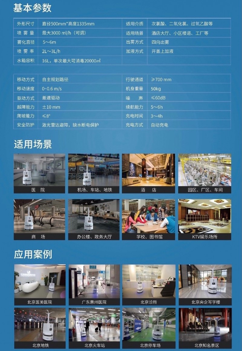 l 精准消毒:360度无死角,喷雾量最大3000ml/h,杀菌率>99.9%, 有效杀灭新冠病毒,雾化颗粒小于10微米 l 语音警报:拟人化语音播报服务