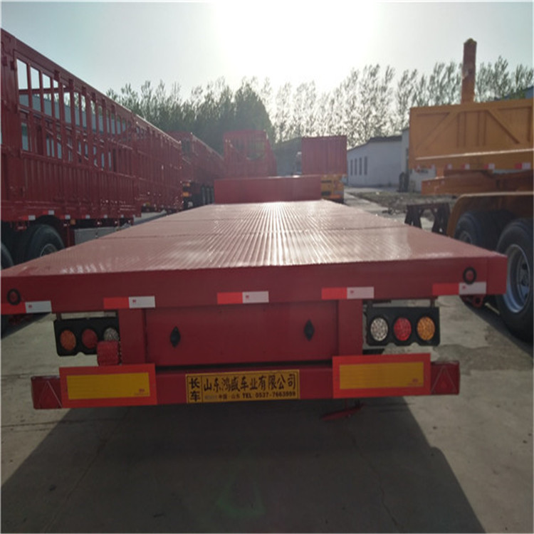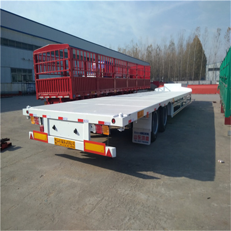 低平板半挂车包括鹅颈式低平板半挂车和特种低平板半挂车系列尺寸有9.5米10.5米11米11.5米12米12.5米13米13.75米 底板平板半挂车,宽度2.8米-3米,款式有高低板,平板式,凹梁式,轮胎外露式,高低高,二轴,三轴,两线四轴高低高,三轴高低高,三线六轴高低高。根据轴数,轮胎的大小,低平板半挂车的载重也是不同的,轴数越多,载重越大,载重范围在20-50吨之间。纵梁采用平直式或鹅颈式,其车架为阶梯型,纵梁截面为工字形,具有刚度高,强度高等特点。 山东鸿盛车业制造 出口型半挂车产品、提供 出口半挂拖车服务、以服务创造出口半挂车打造 、以服务带动营销,对每一个半挂车产品负责,对每一个客户负责。