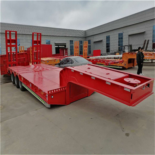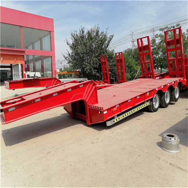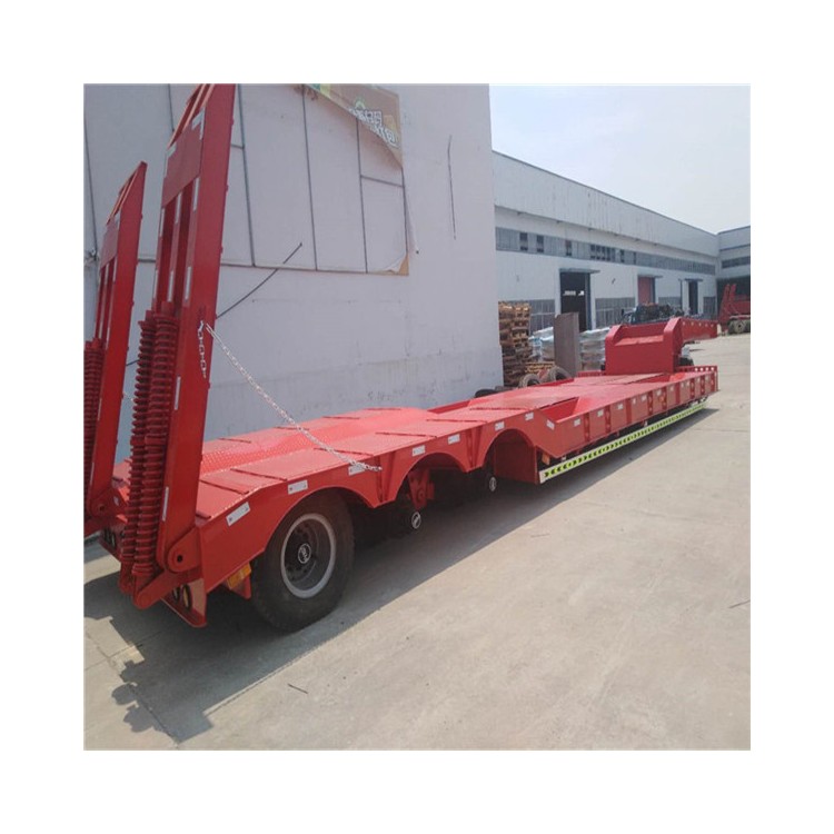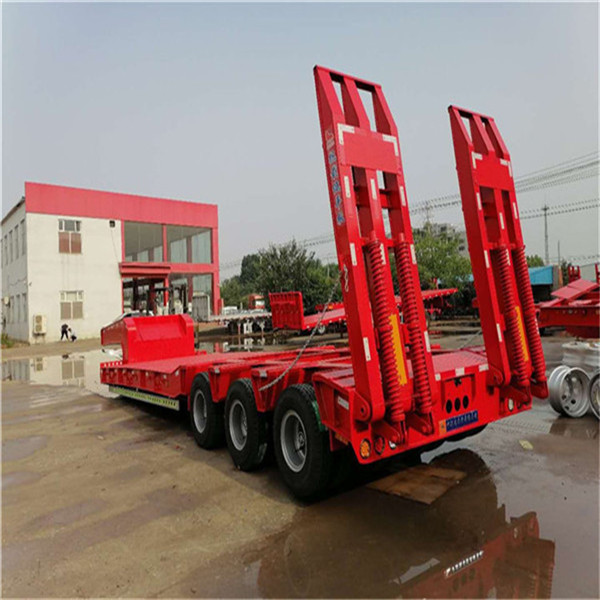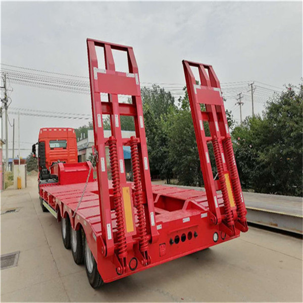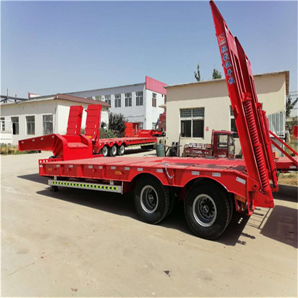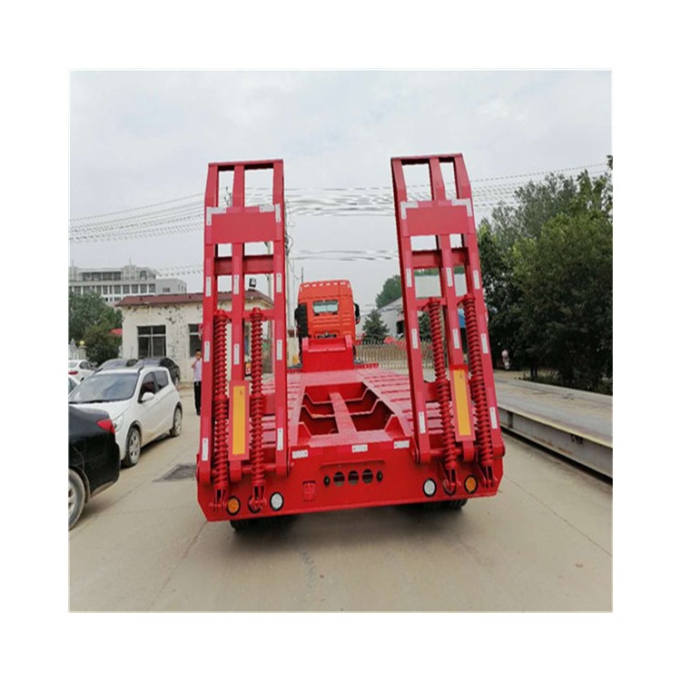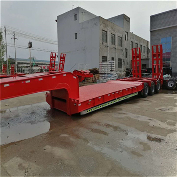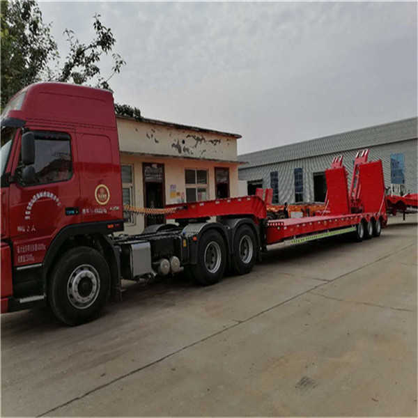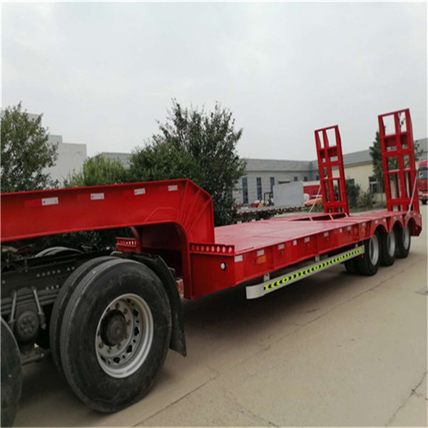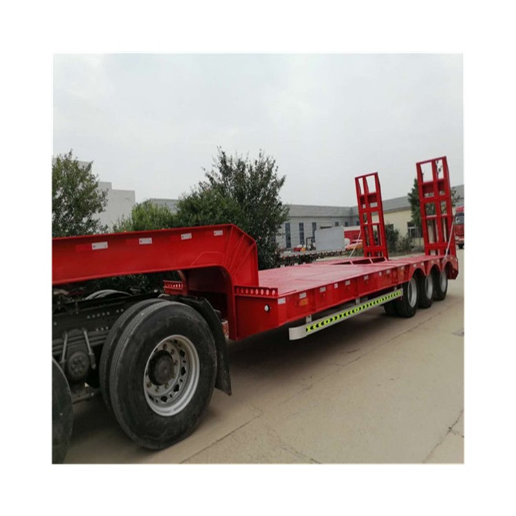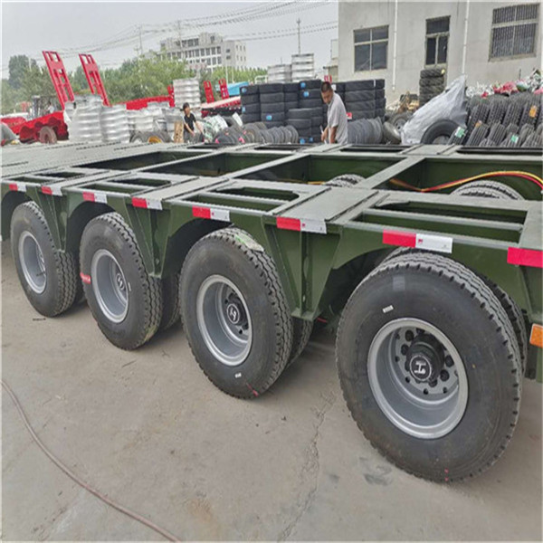 重型低平板半挂车用于装载大型和重货件的挂车。重型挂车的基本形式为单体平板挂车。它一般有下列结构。车架和轮轴 轮轴多为两轴共线,即在一根轴线上有左右两根轮轴,也称作两轴列。常见的单体平板挂车有2~7轴线。一根轮轴装4只轮胎,一道轴线就有8只轮胎。所以全车的宽度可达 3米以上。,一般装用直径小而载重能力大的钢丝子午线宽轮辋轮胎(见汽车轮胎),每只轮胎在低速运行条件下可承受4吨左右的载荷。车架采用度合金钢箱形截面的焊接结构。
