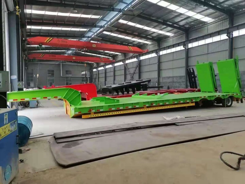 轻型12.5米低平板半挂车尺寸参数价格 纵梁采用自动埋弧焊焊接,车架采用喷丸处理, 穿入纵梁并焊接整体。 悬挂支座组成,结构合理,具有较强的刚性和强度,用来支承载荷缓冲击。