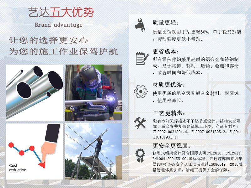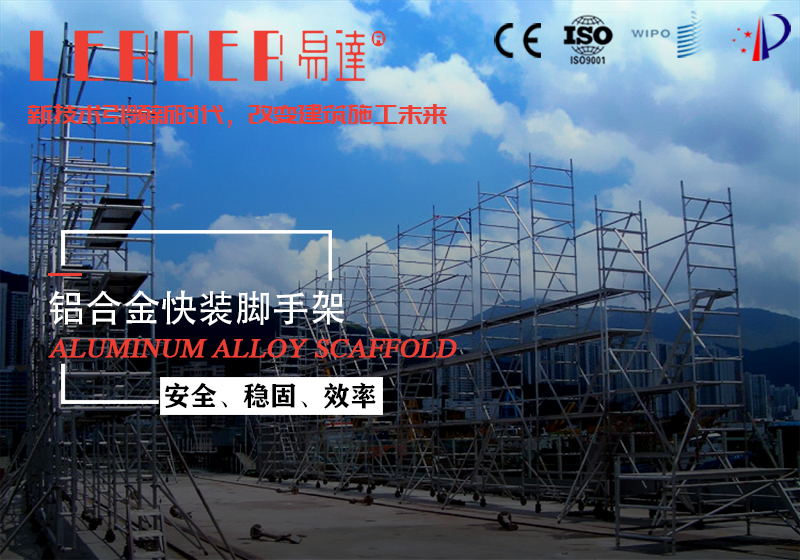 LEADER易达牌铝合金移动式脚手架符 合EN1004:2004标准,并通过德国莱茵集团TUV的GS安全认证。最高级别国际安全及品质标准设计及制造。