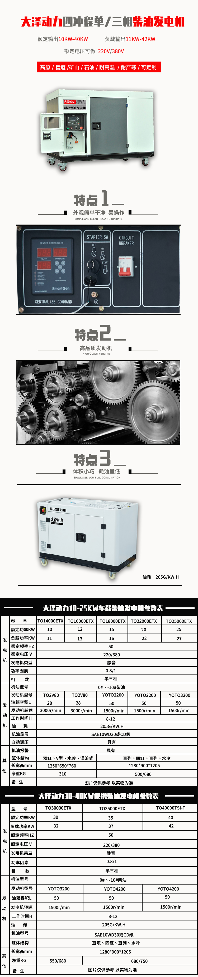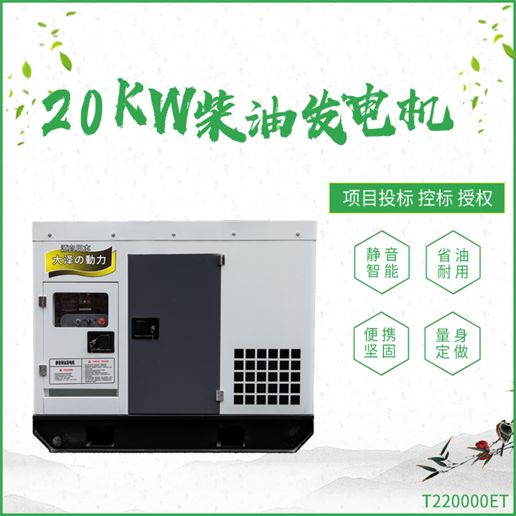 20KW柴油发电机适用范围广、轻巧化设计、输出高品质的电源、出色的静音效果、优异的省油性能、独特的并联运行功能、很好的输出波形、具有起动性能优良、电压稳定、运行可靠、低排放、低噪音,维护方便等优点,设计有名,性能优良,体积小,重量轻,噪音小,选用性强此外,大泽动力系列发电机还有良好的经济性,良好的高原适应能力,柴油机各部件的装配,柴油机装配完毕及返修后试机前的检查,柴油机试机程序的各个检查步骤,柴油机的返修项目记录,柴油机磨合期的各个检查项目,柴油机磨合后正常运行后通过物流送到用户手上。