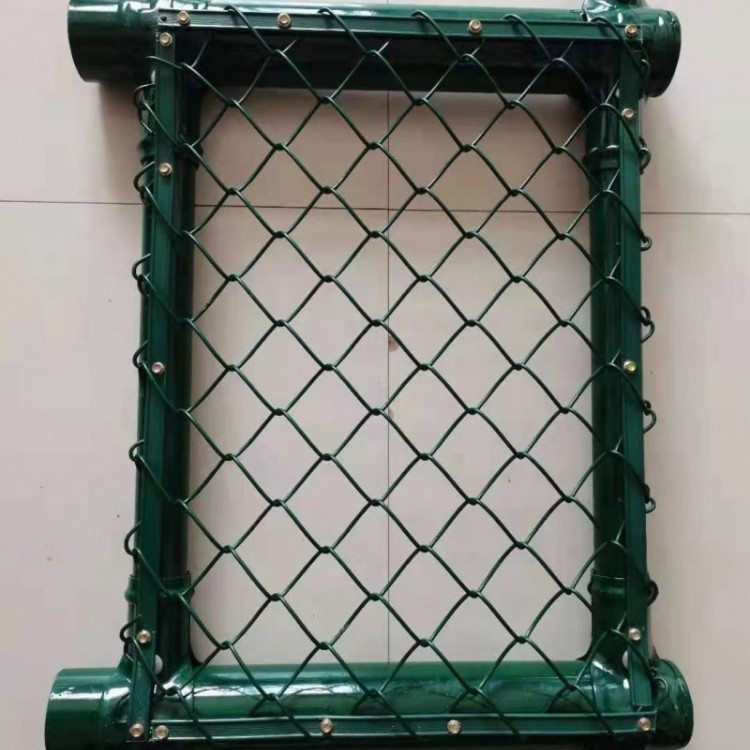 球场围网规格:包塑丝径3.8mm,网孔50*50mm,尺寸为3*4米,立柱75*2mm,横柱60*2mm,外形尺寸4米高,