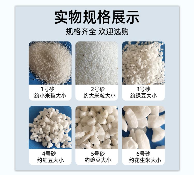 本公司生产石英砂经石英矿破碎加工而成,其二氧化硅含量高达99%以上,产品规格层次分明,颗粒均匀无杂质,机械强度高。适用于水处理过滤,盆景装饰,酒店灭烟,喷砂除锈,地砰材料,铸造业等。欢迎新老顾客咨询订购。