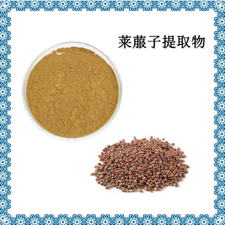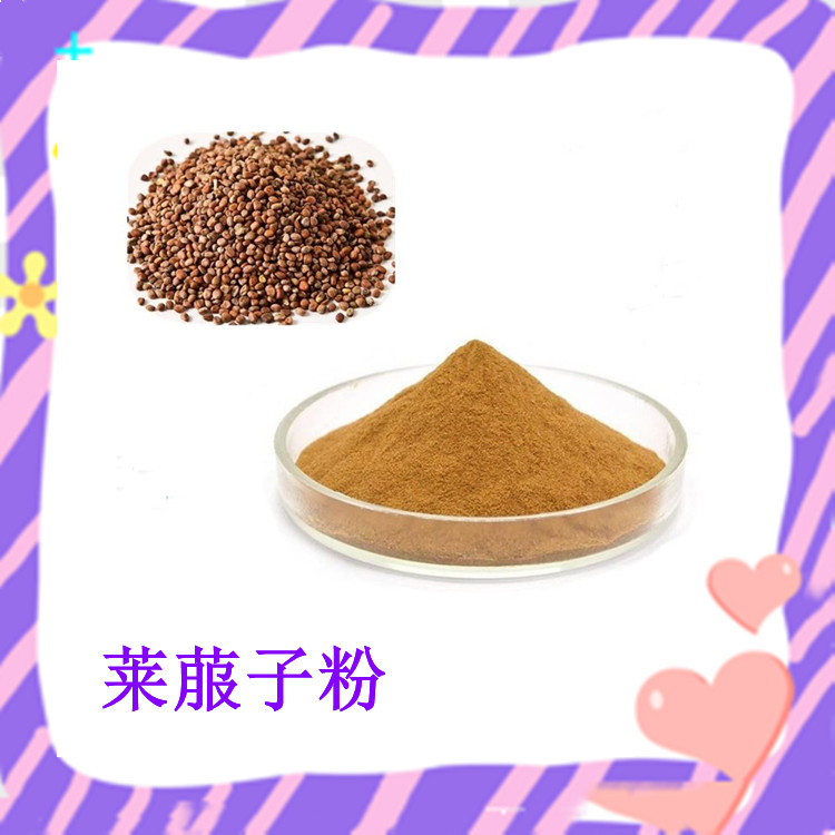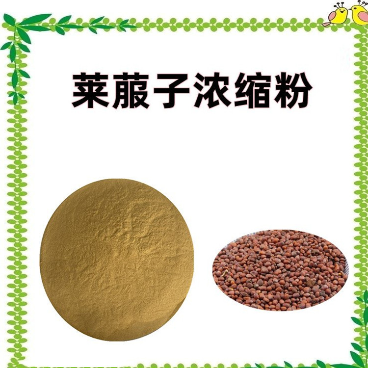 【产品名称】莱菔子粉【原料别名】萝卜子、萝白子、菜头子【提取部位】十字花科植物萝卜的干燥成熟种子【产品性状】精细粉末状【工艺流程】原料挑选→原料清洗、压榨取汁→过滤、澄清→浓缩→喷雾干燥→粉碎→过筛包装【溶解性】全水溶,无沉淀【包装方式】大货25公斤/纸板桶,小样包装为铝箔袋1KG/袋。可根据要求贴标签,如果无特别要求,按公司内部统一标签。【存储条件】本品应密封遮光,贮存在干燥、阴凉、通风良好的地方【有效期】原包装24个月【采收加工】6~7月种子成熟时割取地上部分,搓出种子,晒干,簸净果皮及杂质,收集种子