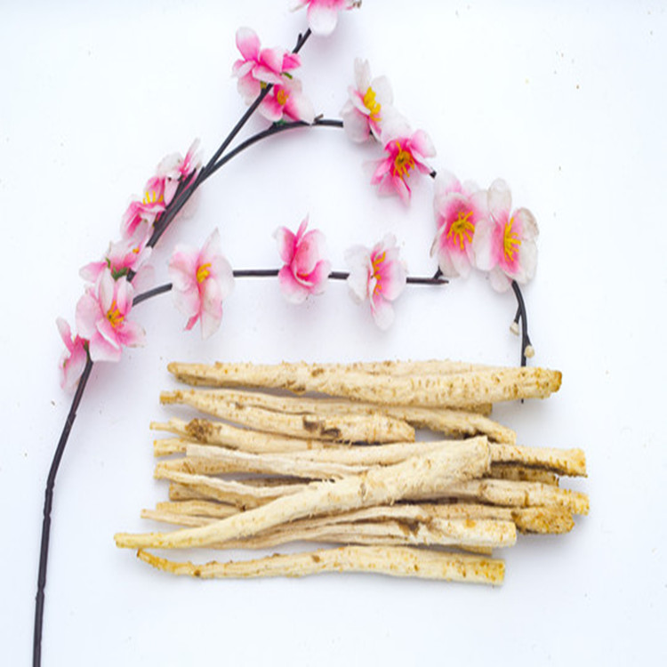 【药材性状】细长圆柱形,偶有分枝,长15~45厘米,直径0.4~1.2厘米。表面淡黄白色,略粗糙,偶有残存外皮,不去外皮的表面黄棕色。全体有细纵皱纹及纵沟,并有棕黄色点状细根痕;顶端常留有黄棕色根茎残基;上端稍细,中部略粗.下部渐细。质脆,易折断,断面皮部浅黄白色,木部黄色。气特异,味微甘。