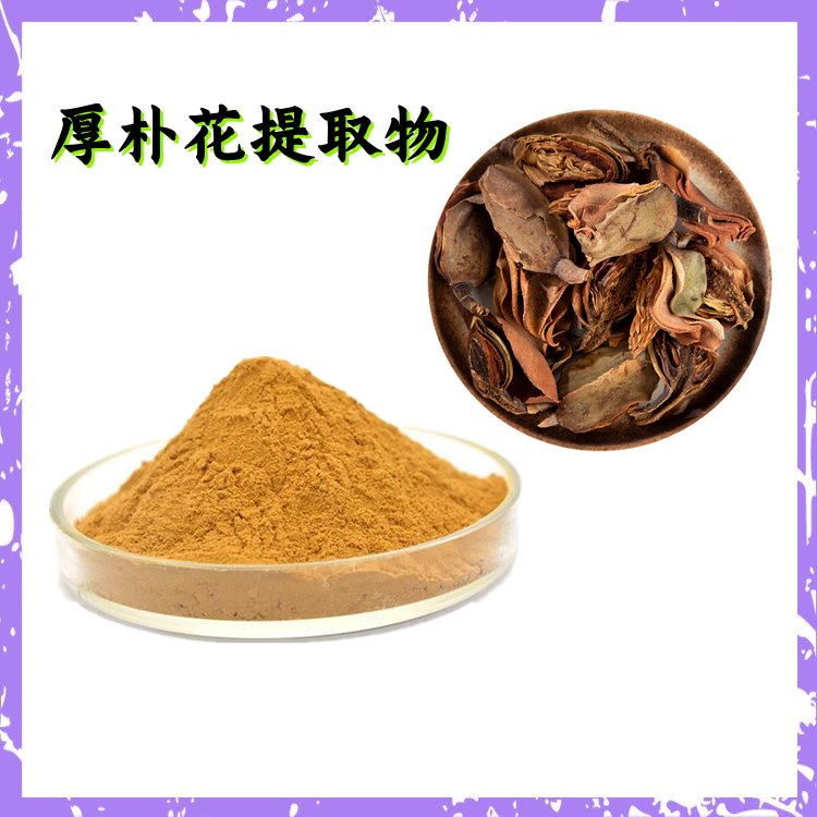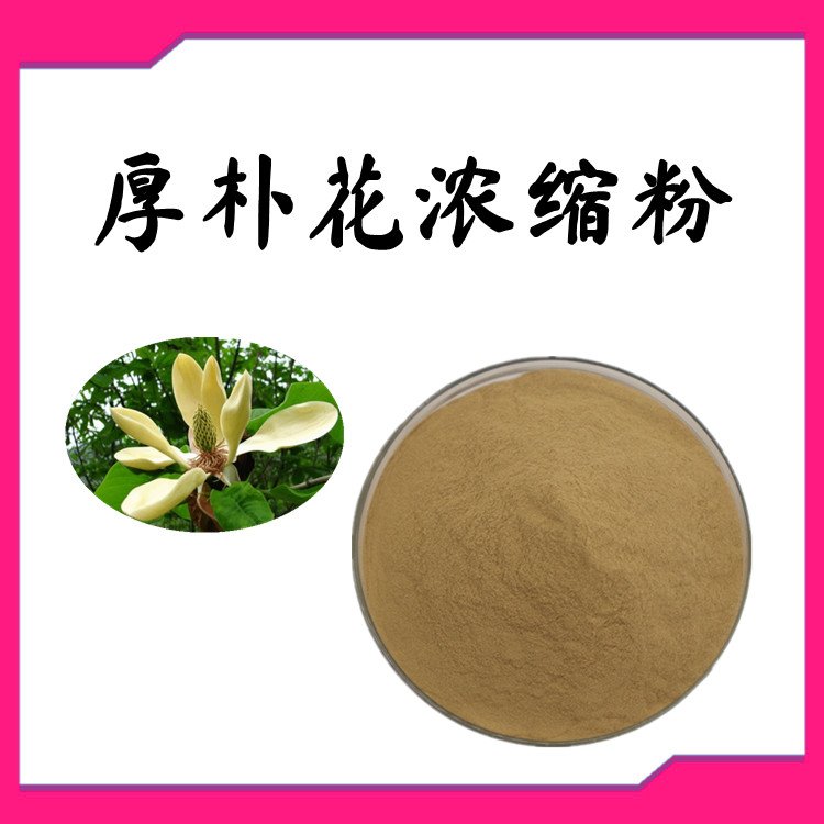 【产品名称】厚朴花浓缩粉【别 名】赤朴,川朴,淡伯,厚皮,厚朴,烈朴,庐山厚朴,重皮【产品简介】本公司生产的厚朴花浓缩粉以厚朴花为原料,采用目前较为先进的喷雾干燥技术加工而成。【生产工艺】精选原料、清洗原料、3遍提取(水/乙醇)、过滤、浓缩、喷雾干燥、过筛灭菌、包装。【产品外观】粉末疏松、无结块,无肉眼可见杂质【产品气味】具有该产品固有的特殊气味【目 数】过80-100目【检测方法】TLC【溶 解 性】水溶性好【规 格】10:1 20:1(可根据客户需求定制生产)【包装方式】大货25公斤/纸板桶,小样包装为铝箔袋1KG/袋【存储条件】本品应密封遮光,贮存在干燥、阴凉、通风良好的地方【有 效 期】两年【厚朴花简介】厚朴花为木兰科植物厚朴的干燥花蕾,每年春末夏初时,其花蕾尚未开花时或稍开时采摘,放在蒸笼中蒸至上气后约10分钟取出,晒干或文火烘干即可入药。其性温,味苦辛,厚朴产于陕西南部、甘肃东南部、河南东南部(商城、新县)、湖北西部、湖南西南部、四川(中部、东部)、贵州东北部。