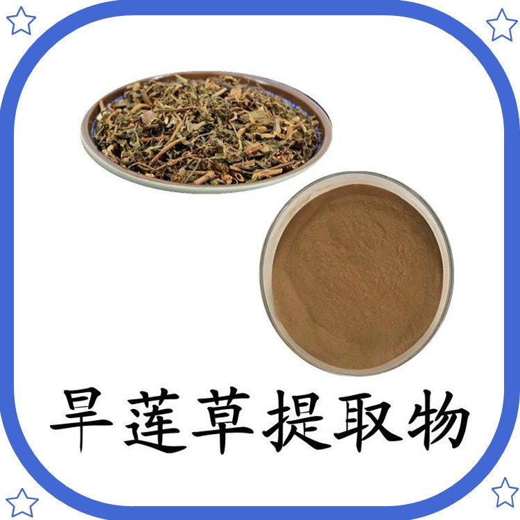 【产品名称】旱莲草提取物【产品别称】墨菜、金陵草、莲子草、墨汁草、水旱莲、黑墨草。【植物来源】菊科植物鳢肠的干燥地上部分。【采收加工】夏、秋季割取全草,洗净泥土,去除杂质,阴干或晒干【产品规格】本品10:1,另有20:1,30:1规格【产品性状】棕黄色粉末【检测方法】TLC【产品包装】内用双层塑料袋1公斤铝箔,外用纸板桶(25公斤/桶)【保存方法】置于阴凉干燥、避光,避高温处。【运输方式】快递或物流,国内快递3-5天内到达,物流5-7天内到达.报价一般均含国内运输费用。偏远地区(内蒙.新疆.西藏)需补运费差价!【保质期】两年