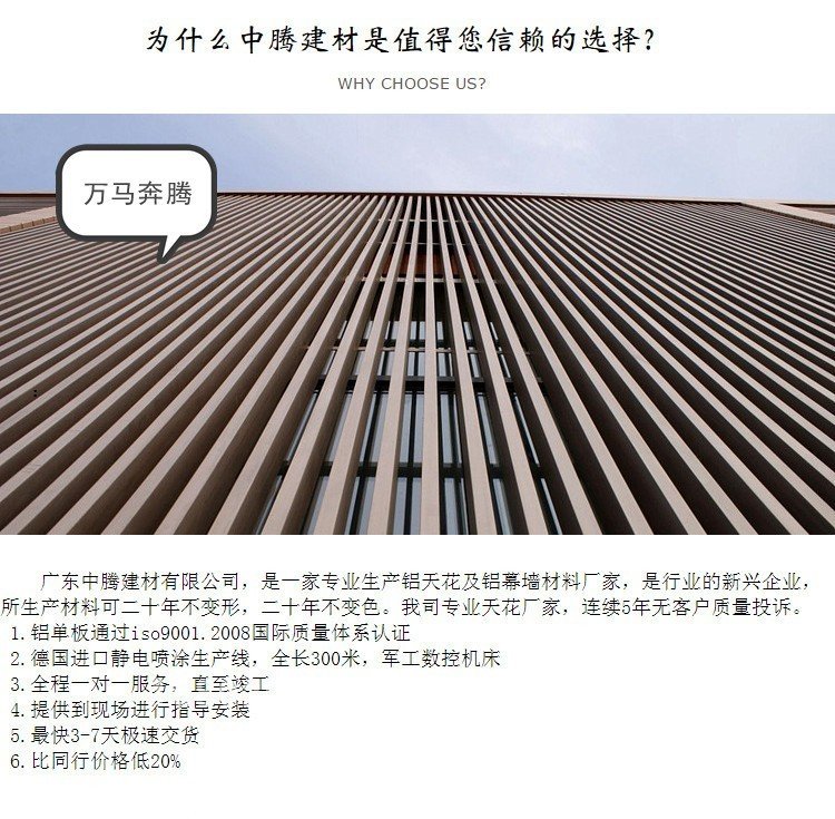 本网页所展示的有关(厂家直销木纹铝方管外墙装饰铝合金方管6060_铝天花_广东中腾建材科技有限公司)的信息/图片/参数等由搜马运营的会员(广东中腾建材科技有限公司)提供,由搜马运营会员(广东中腾建材科技有限公司)自行对信息/图片/参数等的真实性、准确性和合法性负责,本平台(本网站)仅提供展示服务,请谨慎交易,因交易而产生的法律关系及法律纠纷由您自行协商解决,本平台(本网站)对此不承担任何责任。