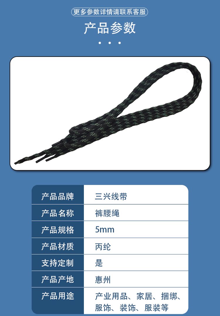 本网页所展示的有关(5mm裤腰绳 草绿色条纹 衣帽绳 绳子 服装捆绑绳 厂家直供_纺织/服装_博罗县三兴线带制品有限公司)的信息/图片/参数等由搜马运营的会员(博罗县三兴线带制品有限公司)提供,由搜马运营会员(博罗县三兴线带制品有限公司)自行对信息/图片/参数等的真实性、准确性和合法性负责,本平台(本网站)仅提供展示服务,请谨慎交易,因交易而产生的法律关系及法律纠纷由您自行协商解决,本平台(本网站)对此不承担任何责任。