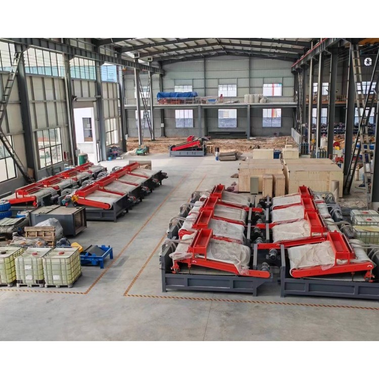 采用带式分选结构,在整个工作区域从进料到出料,物料在皮带的带动下,可对物料进行多次磁搅拌,同时在水流的冲洗作用下,把不含磁的尾矿除去,带有磁性的矿物被皮带输送到板选机的脱磁区,从而将带有磁性的矿物通过脱磁装置脱掉,来完成选矿的过程,整机功率小、处理大,磁场强度高,并达到很好的品质,能够获得大的效益。