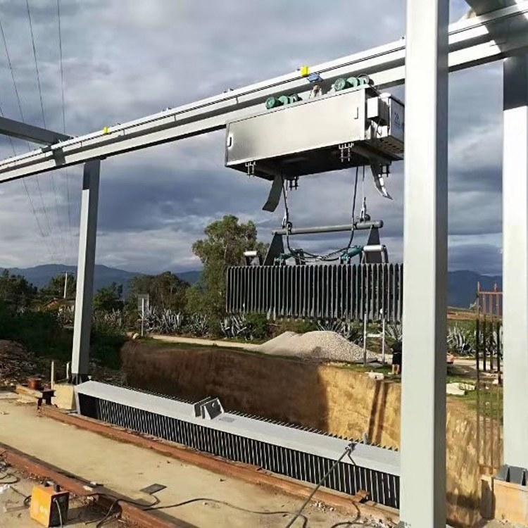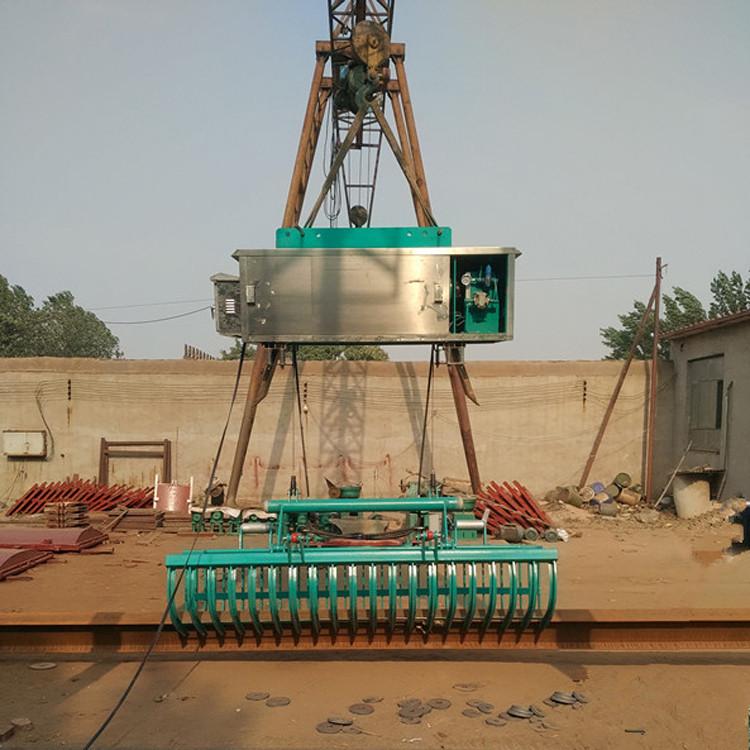 抓斗式清污机通过设置于载重小车上方的驱动装置带动小车沿轨道作平面移动。当到达预定格栅除渣位置后,除渣齿耙在钢丝绳牵引下实行下行运动,当除渣齿耙抵达格栅底部时,控制系统关闭弧形齿耙,同时指令提升电机提升除渣齿耙开始捞渣,齿耙到达预定提升高度后,控制系统指令载重小车移动至指定点卸污。