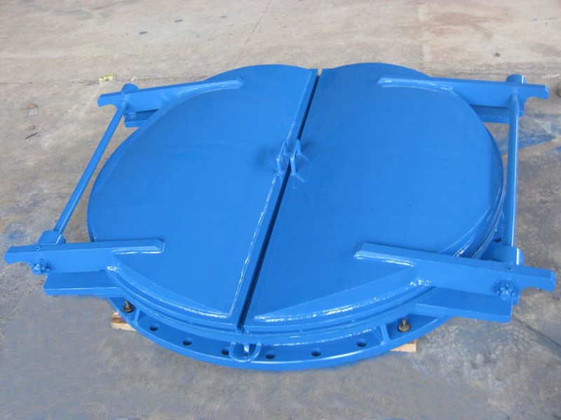 双侧开钢制拍门主要安装在排水管道的尾部,用于防止外水倒灌。材质分为不锈钢、碳钢、铸铁等多种材料,拍门是安装在江河边排水管上,泵站排水管出口的一种单向阀,当江河水高于出水管口,且压力大于管道内压力时,拍门面板自动关闭,以防止河潮水倒灌进排水管道内。经不断发展和改进,目前拍门都为悬挂式,单开门、双开门型号。