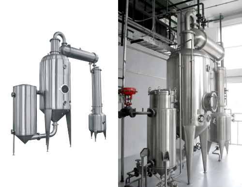 单效外循环真空浓缩器,由加热器、蒸 发器、除沫器、冷凝器、冷却器、受液罐 等组成,凡与物料接触部件均采用不锈钢 制作,本装置适用于制药、食品、化工、 轻工等行业液体物料的蒸发浓缩。本设备 浓缩时间短,蒸发速度快,能较好地保持 热敏性物料不致破坏。