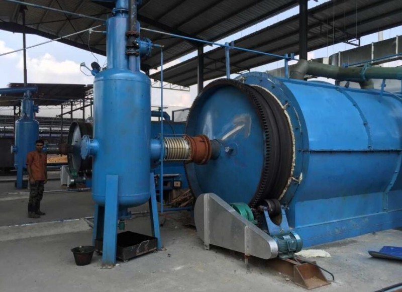 经过冷凝,部分不能冷凝下来的气体,称之为废气,废气经过一道安全设置--水封,(水封的作用是避免明火从燃烧室返回与废气相遇发生爆炸),返回加热室作为燃料加热炉膛。所以,设备操作起初,燃料是煤或木材,当温度上升至220℃-270℃的时候,就可以把废气作为燃料了。一般情况下,每吨废轮胎需要的燃料是60kg。