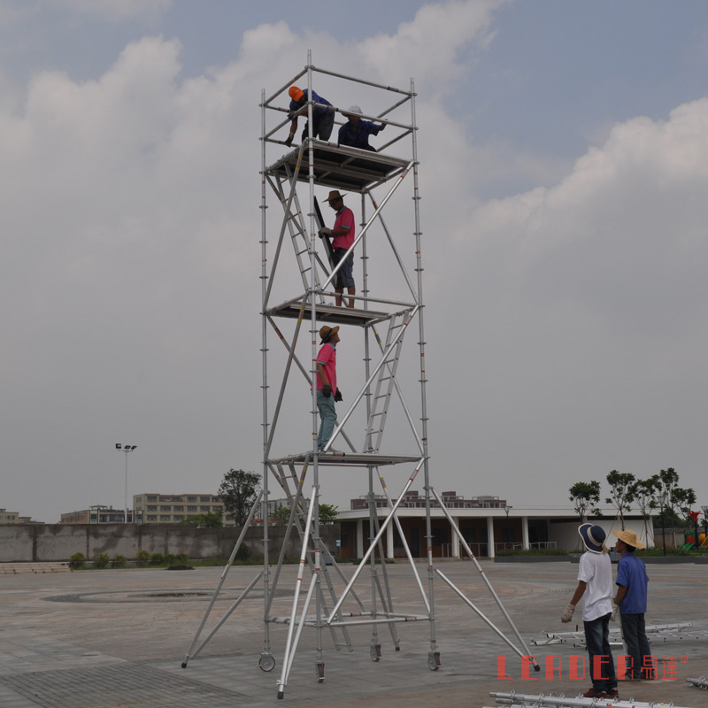 铝架品牌:LEADER易达品牌(厂家独立品牌) 产品名称:组合式铝合金快装移动脚手架 属于脚手架系类产品,由铝合金材料6082-T6型材(又名航天铝型材料)通过加工、技术制造用于各项高空作业平台使用的脚手架系类产 品。常见的铝合金脚手架有焊接框结构铝合金脚手架、盘扣插销式铝合金脚手架、十字分销式铝合金脚手架、单管式铝合金脚手架。 关于组合式铝合金移动塔架介绍: -每层工作平台板平均承载272公斤 易达铝合金脚手架的基本参数: 序号项目铝架参数1标准宽度0.85m和1.45m2标准长度1.8m、2.0m、2.5m、3.0m3管壁厚1.8mm和3.2mm4管材质6082-T65平台允许载荷2.0KN/m2及3.0KN/m26单塔最大高度20m易达组合式铝合金脚手架平台优点 - 容易装卸及搭建,除可单套独立使用外,亦可组成大形结构用于扶手电梯,楼梯,地盘工地等