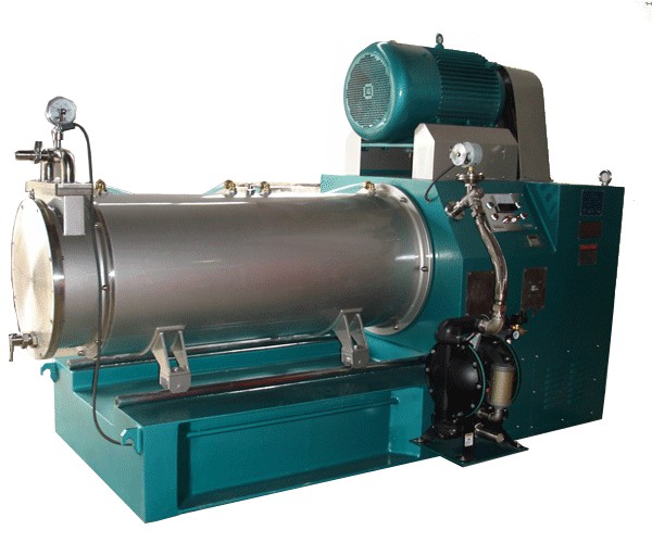 输送泵将经过预稀释搅拌后的液固混合原料泵入筒体内,主轴带动分散涡轮作高速旋转,并搅动筒体内的研磨介质(玻璃球、瓷球、氧化锆珠、氧化铝珠等),使之产生旋流和径轴向运动,从而对产品进行强烈的研磨分散,使产品达到规定的细度,同时由电接点压力表和电接点温度表对其工作压力和工作温度实行自动控制,保证整机的安全运转。其间产品和研磨介质由动态出料间隙分离。适用于大流量,中高粘度的水性,溶剂性超微细研磨