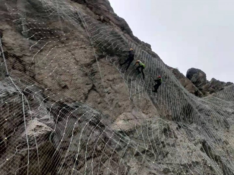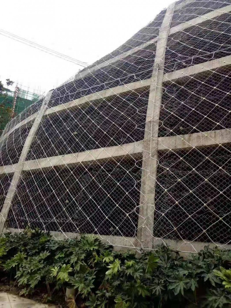 护坡网的产品特性: 具有高柔性,高防护强度,易铺展性。适应任何坡面地形,安装程序标准化、系统化。系统采用模切化安装方式,工期短,施工费用低。系统材料的特殊制造工艺和高防腐防锈技术,决定了系统的超高寿命。系统能将工程队对环境的影响降到点,其防护区域可以充分的保护土体、岩石的稳固,便于人工绿化,有利于环保。工程施工中本产品呈网状散布,无视觉干扰,便于人工造林,且有利于周围环境与工程融合,为了保护车辆及行人在需要防护的山体部位安装钢丝绳网为抽要材料的防护体系,主动防护网是钢丝绳网紧贴在山体上,将松懈的石头包裹在山上,不让碎石从山上滚落或掉下,故此主动防护网适用于山坡及山崖的防护。