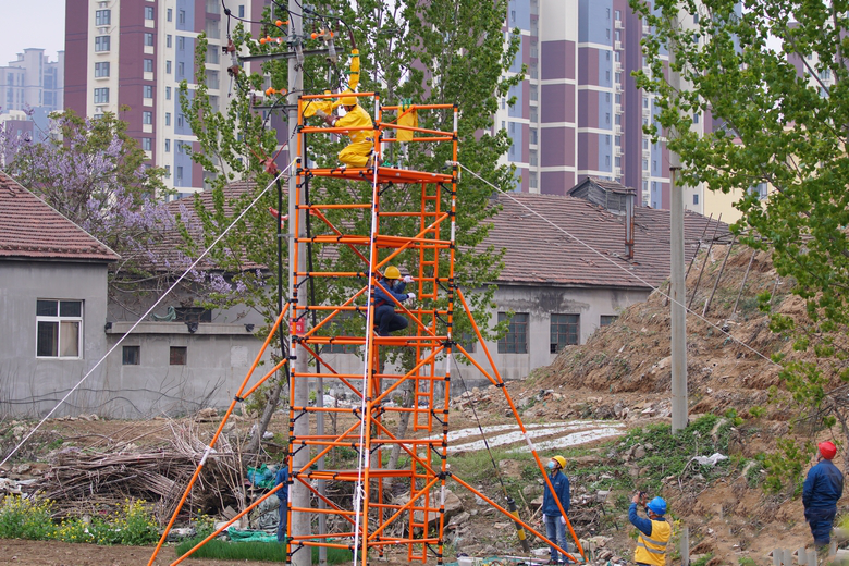 由梯架、横向连接杆和斜拉连接杆,以及支撑杆加绝缘平台板组合搭建而成;绝缘脚手架(平台)搭建快捷,拆装简单,无须任何安装工具,整体无金属结构,具有耐腐蚀、抗老化、使用方便、安全程度高、绝缘性能强等特点,适用于多种带电施工场所和高空带电作业,弥补了绝缘斗臂车不能进场施工的不足。