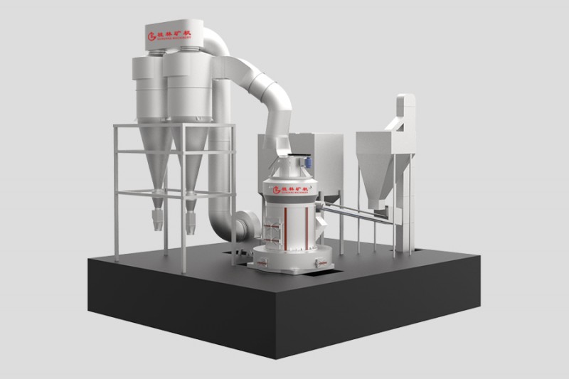 物料经颚式破碎机破碎成小于35mm的物料,经斗式提升机提升到储料斗,再由电磁振动给料机定量送入主机腔进行研磨,主机腔内支承在梅花架上的4个磨辊装置绕中心轴旋转,磨辊在离心力的作用下向外摆动,从而使磨辊压紧磨环,磨辊同时绕磨辊轴自转。被旋转的铲刀扬起的物料被抛向磨辊与磨环之间,因磨辊的滚碾而达到粉碎和研磨作用。