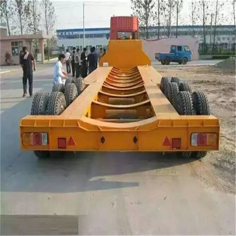抽拉低平板半挂车通常采用凹梁式车架,即车架前段为鹅颈,中段为货台(车架低部分)后端为轮架(含车轮)。在往低平板半挂车上装载机械设备时,通常是从半挂车后端装载机械设备,即采用从后轮架上面移动机械设备或者将车轮移除的方式,然后再将机械设备固定在半挂车上。