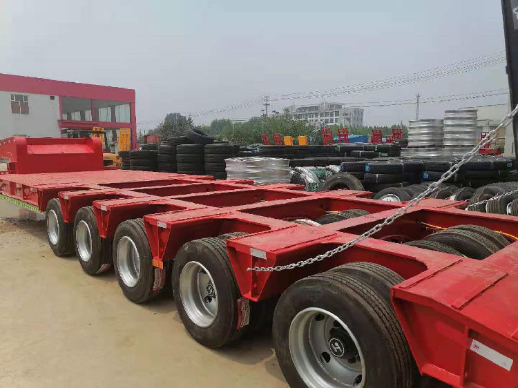 低平板半挂车 采用凹梁式(或者井型)车架,既车架前段为鹅颈(鹅颈前段的牵引销与牵引车上的 牵引鞍座相连,鹅颈后端与半挂车架相连),中段为货台(车架 部分),后端为轮架(含车轮)。在往低平板半挂车上装载机械设备时,通常是从半挂车后端装载机械设备,即采用从后轮架上 面移动机 械设备或者将车轮移除的方式, 然后再将机械设备固定在半挂车上。