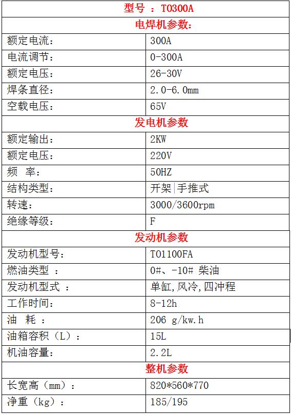 采用发电、弧焊、性能稳定、设备齐全、配气电磁阀油、高低电流选择开关、报警装置、重量轻、移动方便,别适用于高、危险、眩力焊机的焊接。NG。大功率焊接工作更稳定,飞溅少,感觉良好,光滑。它具有高功率的油气电磁阀和焊机,比其他设备效率高40%,而且运行成本更具竞争力。